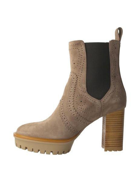 Botín de mujer Pedro Miralles fabricado en piel nobuck color topo. Interior y plantilla de piel. Elásticos en los laterales y tirador trasero que facilitan el calce. Suela de goma. Tacón de 9,5 centimetros y plataforma de 3 centimetros.