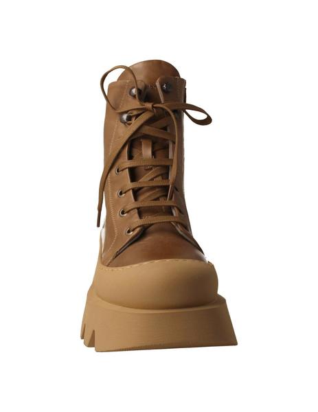 Botín para mujer de Patrizia Bonfanti fabricado en piel de color taupe. Interior forrado en piel. Plantilla extraible. Piso de goma con una altura de 5cm aproximadamente. Cierre con cordones y cremallera.