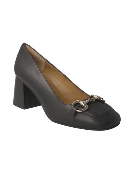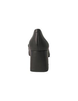 Zapato para mujer de Pedro Miralles fabricado en piel de color negro. Interior y plantilla en piel. Puntera cuadrada. Detalle de hebilla metálica en el empeine. Tacón forrado en piel con un altura de 6 cm. Suela de goma flexible y antideslizante. Hecho en España.