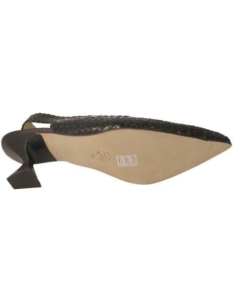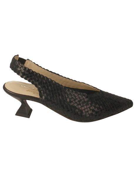 Zapato destalonado para mujer de She&he fabricado en piel trenzada de color negro. Interior y plantilla de piel. Cierre con elástico en el talón. Tacón con una altura de 6 cm. Suela de cuero. Hecho en España.