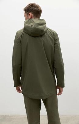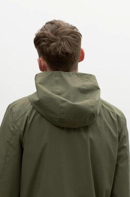 Parka vegana 3/4 con capucha para hombre de Ecoalf modelo Anetoalf de color verde, confeccionada con un 59% de poliéster reciclado procedente de botellas de plástico y un 41% de Sorona derivado de los residuos de la producción del maíz. Costuras termoselladas, repelente al agua y transpirable. Cuatro bosillos deanteros y uno interior, todos ellos con cremallera. Logo ECOALF en la manga.
