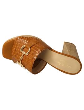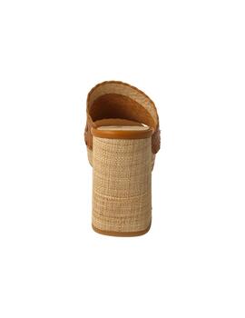 Sandalia destalonada para mujer de She&he fabricada en piel trenzada de color cuero. Interior y plantilla de piel. Detalle de adorno metálico en el empeine. Piso de goma. Tacón forrado en rafia con una altura de 9 cm. y plataforma de 2,2 cm. Hecho en España.