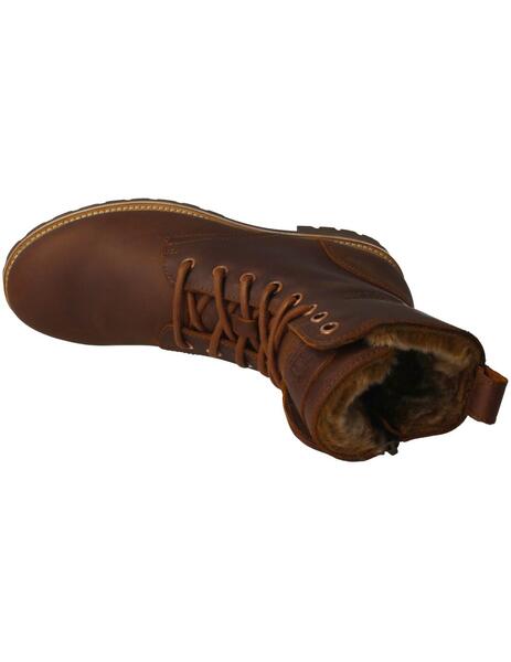 Botín de mujer Panama Jack fabricado en piel engrasada de color cuero con membrana Waterproof resistente al agua. Forro interior de pelo. Plantilla anatómica extraíble . Suela de caucho natural, flexible y resistente con tacón de 3,5 cm. Cierre de cordones y cremallera lateral. Hecho en España