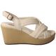 Sandalia para mujer de Igi&Co fabricada en piel de color blanco con tiras cruzadas en el empeine. Plantilla acolchada en piel. Cierre con hebilla en el tobillo. Cuña con efecto rafia de 8 cm. y plataforma de 2,5 cm. Hecha en Italia.