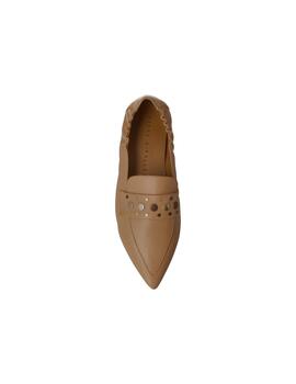 Mocasín para mujer de Pedro Miralles fabricado en piel de color beige. Interior y plantilla de piel. Detalle de antifaz con tachas en el empeine que aportan un toque especial y sobrio a su vez. Suela de cuero sintético con tacón forrado en piel al tono de de 1,5 cm. Hecho en España. Una apuesta perfecta para aquellas que quieren lograr estilismos elegantes sin renunciar a ir con zapato plano.