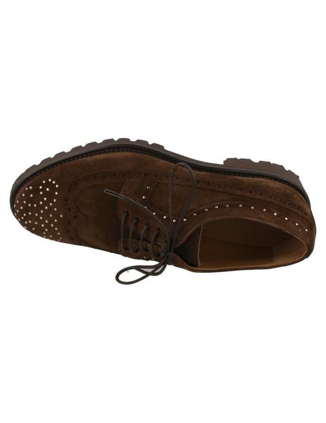 Zapato de cordón para mujer de Calce. Confeccionado en piel vuelta color marrón. Combina la piel vuelta con detalle de pequeñas tachas en color dorado. Forro y plantilla de piel. Piso de goma comfort light.