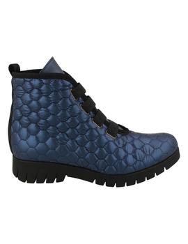 Botín para mujer de Lua Lua. Confeccionado en tejido textil efecto colmena, en color azul metalizado. Forro y plantilla de piel. Tiras elásticas negras en el empeine. Piso de goma.