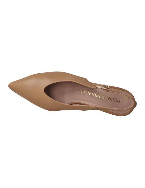 Zapato destalonado para mujer de Pedro Miralles en color camel. Interior y plantilla en piel. Cierre con hebilla ajustable en el lateral de color dorado. Piso de goma con cómodo tacón dorado de 6 cm. Hecho en España.