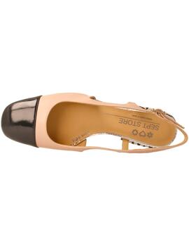 Zapato destalonado para mujer de Sept Store fabricado en piel de color rosa con puntera Chanel en color negro. Interior en piel. Plantilla acolchada en piel. Cierre con hebila lateral. Cómodo tacón de 4,5 cm. con dibujo en blanco y negro que lo convierten en un zapato con estilo único y elegante. Piso de de suela sintética. Hecho en España.