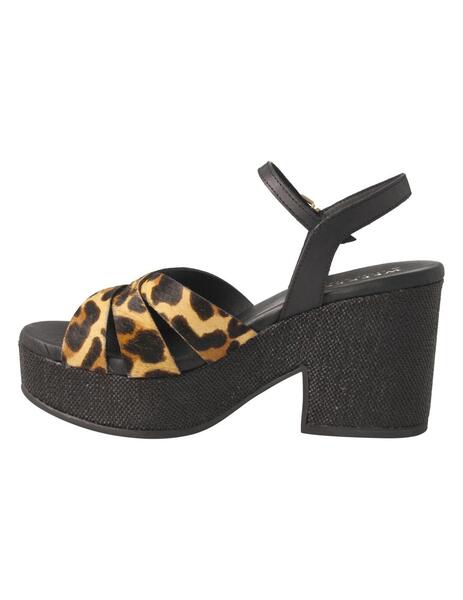 Sandalias para mujer de Weekend by Pedro Miralles elaboradas en piel de color negro y piel con pelo con distintas tonalidades de beige en las tiras cruzadas sobre el empeine. Tacón de rafia de 8 cm. con plataforma de 4 cm. La plataforma cuenta con un sutil efecto brillo que eleva su sofisticación. Cierre de pulsera al tobillo con hebilla regulable. Eleva tus looks más veraniegos con estas sandalias estampadas.