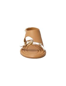 Sandalia para mujer de Elvio Zanon, fabricada con piel suave de alta calidad en color beige. Interior y plantilla en piel. Detalle de tira de piel en tono dorado en el empeine con hebilla regulable. Cierre con hebilla ajustable en el lateral. Piso de goma con tacón de 0,5 cms. Una sandalia femenina de diseño elegante y moderno, ideal para ocasiones formales e informales, ofrece durabilidad y confort. Su ajuste cómodo y sus detalles bien cuidados lo hacen versátil y adecuado para diferentes estilos y ocasiones.