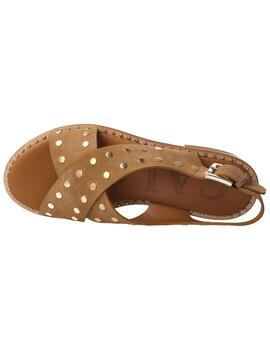 Sandalia para mujer de Calce fabricada en ante de color camel con dos tiras cruzadas adornadas con tachas doradas. Interior y plantilla acolchada en piel. Detalle de tachas alrededor de la hebilla. Cierre con hebilla lateral ajustable. Suela de cuero con tacón de 3 cms. Calce es una firma española donde todos sus zapatos están hechos por artesanos que cuidan cada detalle, por lo tanto esto garantiza la calidad del producto y de sus materiales.