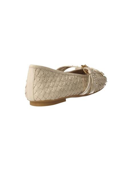 Bailarina para mujer de Elvio Zanon estilo Mary Jean fabricada con piel trenzada de alta calidad en color blanco. Interior y plantilla en piel. Detalle de lazada en el empeine y dos tiras de piel con hebillas regulables . Piso de goma con tacón de 0,5 cms. Una bailarina femenina de diseño elegante y moderno, ideal para ocasiones formales e informales que ofrece durabilidad y confort.