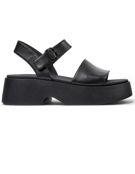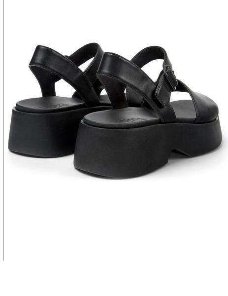 Sandalias Tasha de Camper, inspiradas en las plataformas de los años 90. Estas sandalias presentan un diseño de plataforma con una suela ligera y una plantilla anatómica que ofrece comodidad durante todo el día. Están confeccionadas en cuero negro de alta calidad y cuentan con una correa en el tobillo ajustable con hebilla para un ajuste seguro. La suela está fabricada con material EVA XL EXTRALIGHT®, conocido por su ligereza y durabilidad